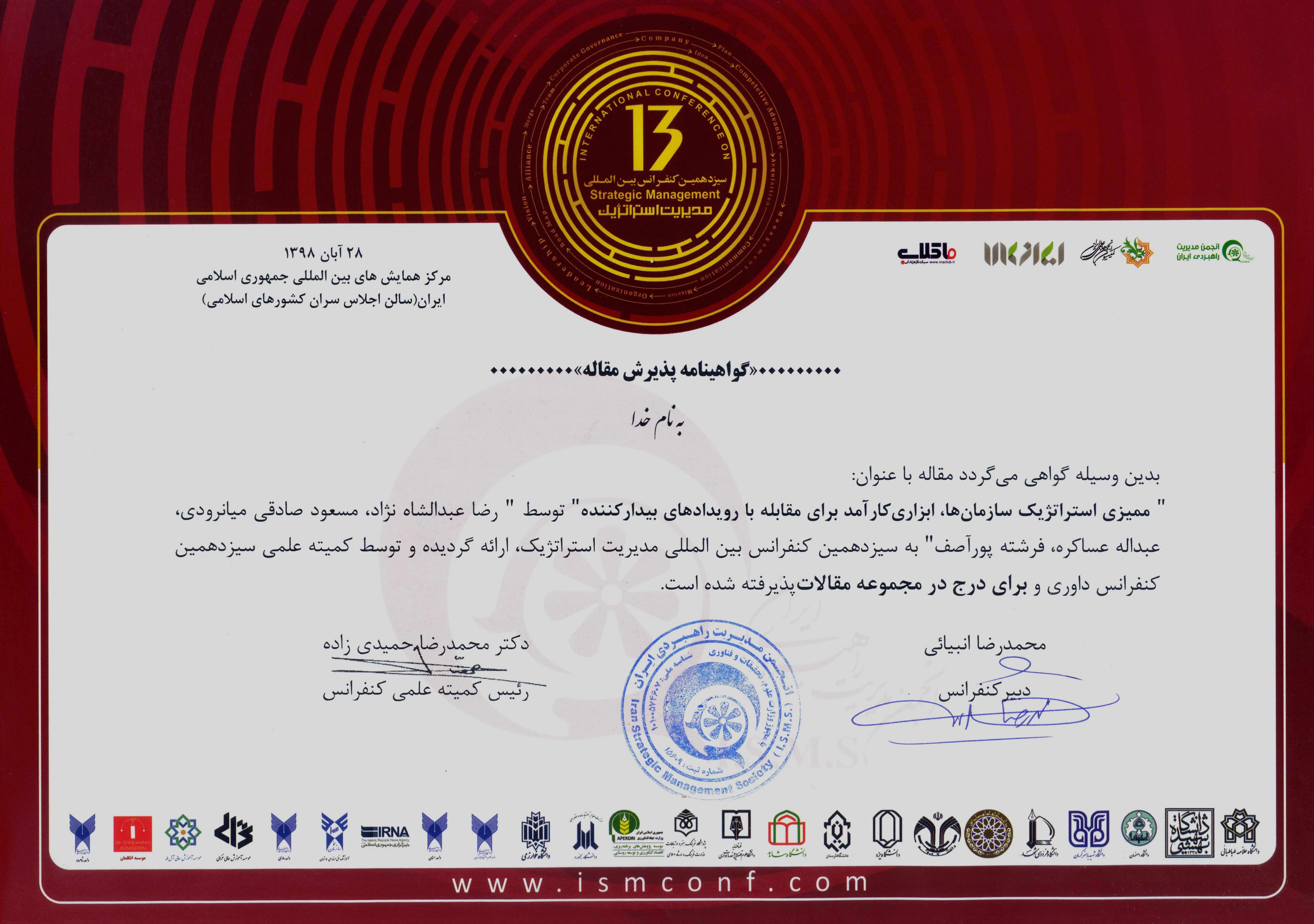 به گزارش روابط عمومی شرکت بهره برداری از شبکه های آبیاری کرخه و شاوور ، مقاله مشترک همکاران دکتر رضا عبدالشاه نژاد ، دکتر مسعود صادقی میانرودی ، مهندس عبداله عساکره و مهندس فرشته پور آصف ، تحت عنوان ” ممیزی استراتژیک سازمان ها ، ابزاری کارآمد برای مقابله با رویداد های بیدار کننده ” توسط کمیته علمی سیزدهمین کنفرانس بین المللی مدیریت استراتژیک مورد پذیرش و در مجموعه مقالات کنفرانس درج گردید.