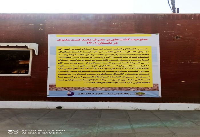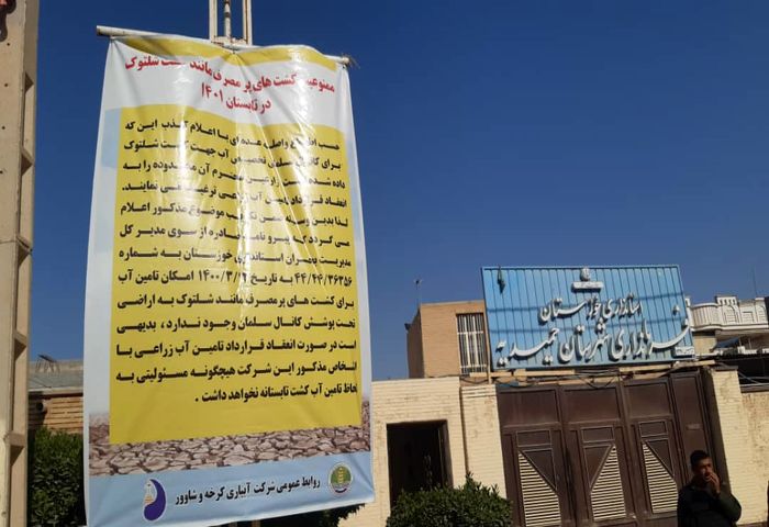 وی با بیان این مطلب که از اواخر سال ۱۴۰۰ با توجه به کمبود شدید منابع آبی و بر اساس تصمیمات استانداری و اعلام سازمان آب و برق خوزستان، ممنوعیت کشتهای تابستانه در شبکههای تحت پوشش این شرکت به طور مکرر اطلاع رسانی شده است افزود: بدین وسیله ضمن تکذیب خبر جعلی تامین آب کانال سلمان در تابستانه ۱۴۰۱ پیرو نامه صادره از سوی مدیر کل مدیریت بحران استانداری خوزستان، مورخ سوم اسفند ماه ۱۴۰۰ اعلام میگردد: امکان تامین آب کشتهای تابستانه نظیر شلتوک و… در اراضی تحت پوشش کانال سلمان وجود ندارد .